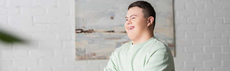 Portrait of smiling laughing teenager guy with Down syndrome green background. Advertising children's cosmetics, products, hair care products, medicines, perfumes, cosmetology, courses, schools, colleges and trainings. Genetic disease world day