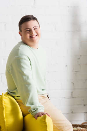 Portrait of smiling laughing teenager guy with Down syndrome yellow background. Advertising children's cosmetics, products, hair care products, medicines, perfumes, cosmetology, courses, schools, colleges and trainings. Genetic disease world day