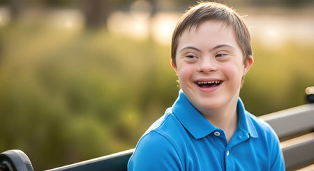 Boy with Down syndrome, dressed in blue polo shirt, smiles while sitting on a bench in a park, surrounded by lush greenery, highlighting joyful social interaction