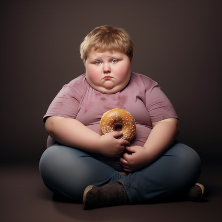 Little chubby boy holding sweet donut in hands. Children health and dieting, excess of junk sweet food in daily eating menu. Generative ai portrait of overweight kid