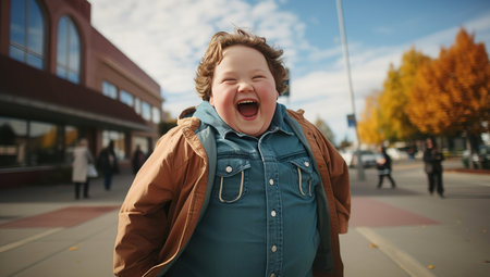 A joyful fat child with a wide-open mouth in happy laughter against an autumnal landscape and street background.