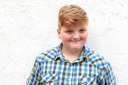 Plump red-haired boy is smiling. A boy in a plaid shirt stands on a wall background and smiles.