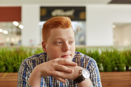A horizontal portrait of freckled redhead boy wearing checked shirt and elegant watch sitting over green plantations holding his hands together looking aside while waiting for somebody.