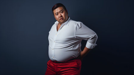 Portrait of a fat Asian man wearing a white shirt and red pants.