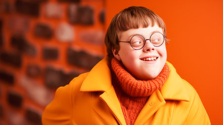 Portrait of smiling laughing teenager boy with Down syndrome orange background. Advertising children's cosmetics, products, hair care products, medicines, perfumes, cosmetology, courses, schools, colleges and trainings. Genetic disease world day