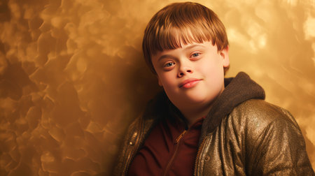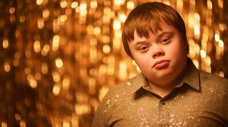 Portrait of smiling laughing teenager guy with Down syndrome golden background. Advertising children's cosmetics, products, hair care products, medicines, perfumes, cosmetology, courses, schools, colleges and trainings. Genetic disease world day