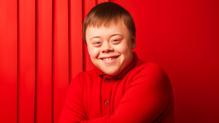 Portrait of smiling laughing man with Down syndrome red background. Advertisement of men's cosmetics products, hair care products, medicines, perfumes, cosmetology, courses, school college and trainings. lifestyle, World Day of Genetic Diseases