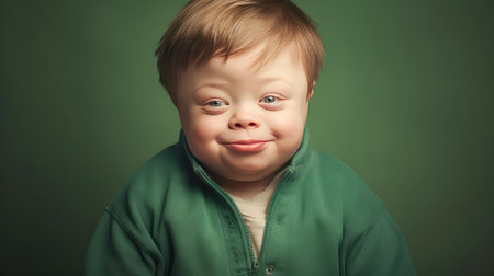Portrait of smiling laughing boy child with Down syndrome green background. Advertising children's cosmetics, products, hair care products, medicines, perfumes, cosmetology, courses, schools, colleges and trainings. Genetic disease world day concept