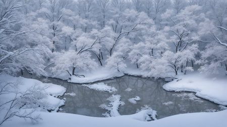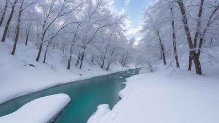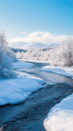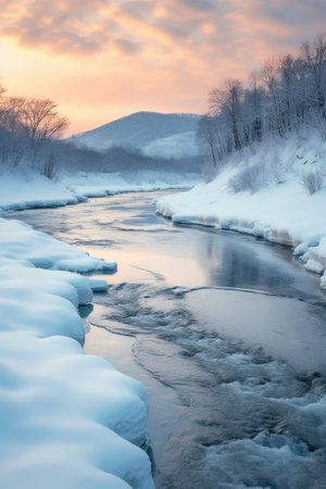 icy river flowing through a snow-covered landscape, created with generative ai