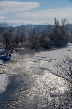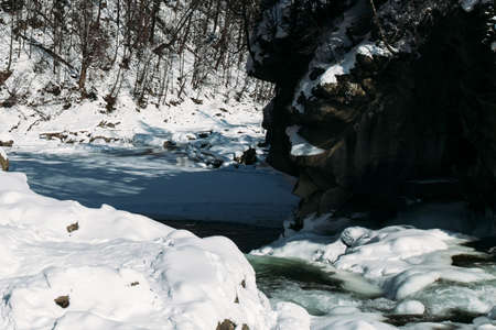 Winter landscape with river and snow covered trees. Beautiful winter landscape in the mountains.