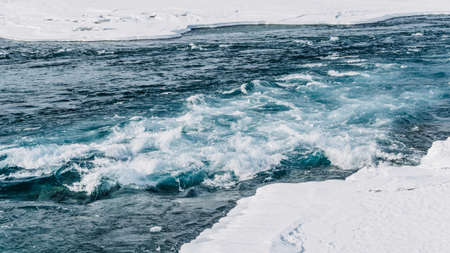 Blue winter river flows between ice floes. Arctic landscape on sunny day. Water boils and forms ripples on the sea.
