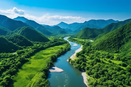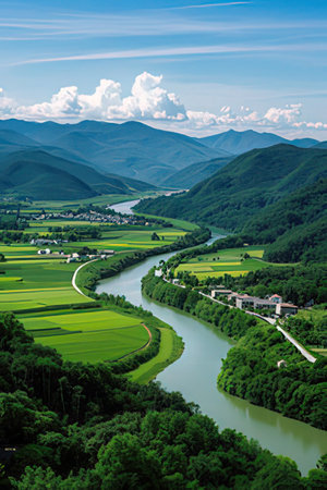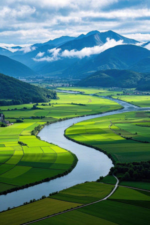 A breathtaking view showcases a winding river traversing lush green mountains, bathed in soft morning light, perfect for representing tranquility in nature.