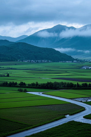 Rural fields and distant mountain cloud landscape