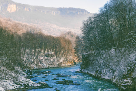 granite riverbed of the Belaya mountain river in Adygea on a frosty winter morning