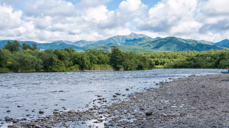 Blue river on a sunny summer day. The pebbles on the bottom are visible through the clear water. There is lush green vegetation on the shore. A mountain range against a clear azure sky. Kamchatka