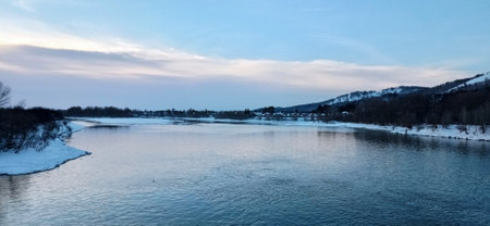 Northern landscape of Primorsky Territory, Samarga River. Frozen river in the taiga against the background of hills with coniferous trees at sunset