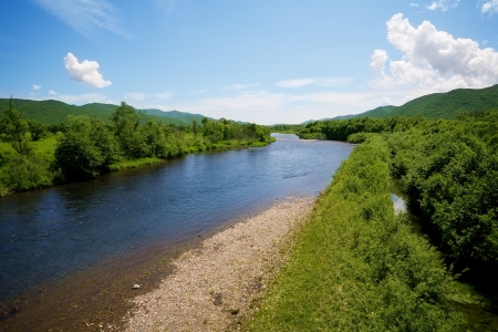 River summer landscape with bright blue sky and clouds