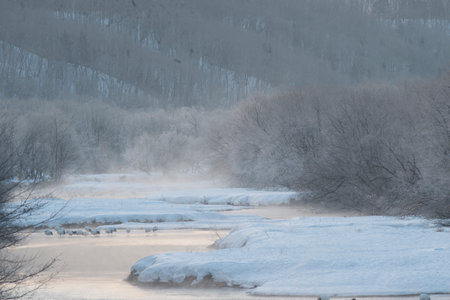Japanese crane roost in the winter early-morning