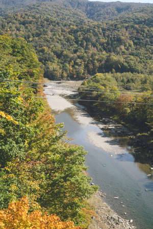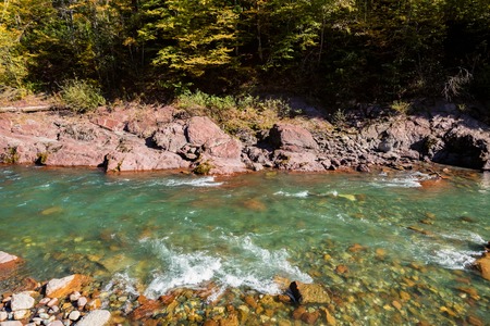 Beautiful autumn landscape with mountain river and colorful forest in sunny day