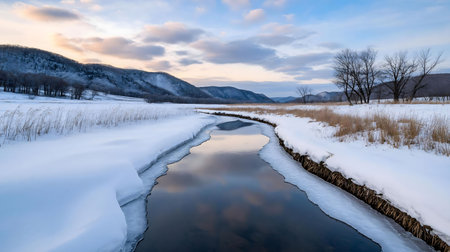 A stunning winter scene showcasing a frozen river reflecting the mountains under a beautiful dawn sky.