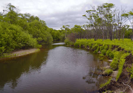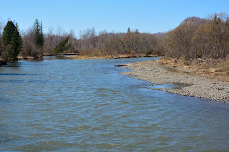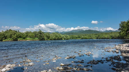 Blue river flows under an azure sky. A sunny summer day. Kamchatka