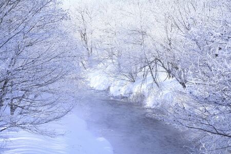 Blue River White Snow contrast background Biei Japan nature cold water winter. High quality photo