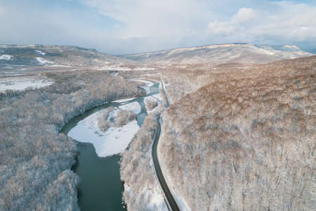 An aerial view of a frozen river flowing through snow-covered forests on a cloudy sunset sky background.