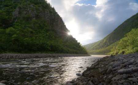 Landscape of the river in the mountains on a sunny summer day. Khakassia, Siberia, Russia,Togyz-Az