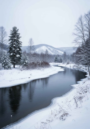A serene river gracefully flows through a picturesque snowy forest, while majestic mountains stand tall in the background, together creating a breathtaking winter landscape that captivates