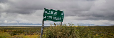 Signpost in the middle of steppen patagonia landscape, puerto madryn, chubut province, argentina