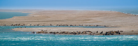 A colony of birds and South American sea lions (Otaria flavescens) in the Loberia viewpoint near Puerto Piramides in Peninsula Valdes, a nature reserve on the Patagonian coast of Argentina.