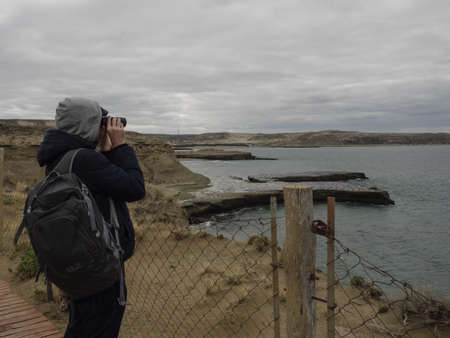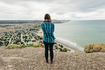 Peninsula Valdes, Argentina; December 29 2022: Young woman at viewpoint watching wildlife marine at peninsula valdes, viedma department, chubut province, argentina