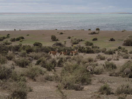 Patagonian Lama, Guanaco (Lama guanicoe) with flightless birds the Rhea. Seen at Punta Tombo, Argentina.