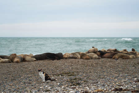 nasty cat sitting in front of a group of seals resting on a rocky beach at the coast of Patagonia in Argentina, causing fear and disturbance