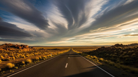 An asphalt road stretches toward the horizon under a vast, cloud-filled sky. The image features a desert environment with muted colors and natural textures. The composition creates a sense of depth and perspective. Suitable for travel, transportation, or scenic concepts in commercial contexts.