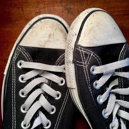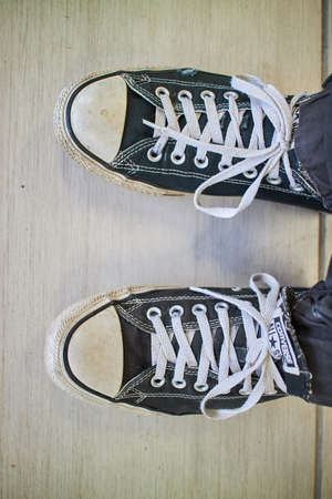 Old worn canvas shoes on a wooden floor Vintage Retro Filter.