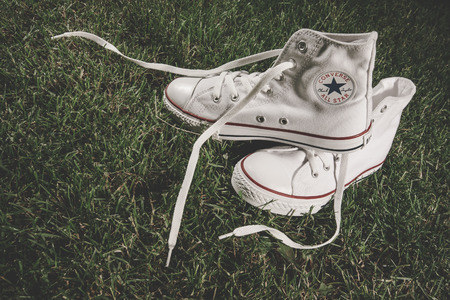 ESKISEHIR, TURKEY - MAY 28, 2010: White Converse sneakers on green grass