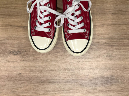 Funny Different Sneakers, Red and White Sneakers on Ground or Floor Background Great For Any Use.