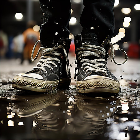 Closeup Grunge Style Photo Of a Women's Legs Dressed in Stylish Youthful Gumshoes Standing on the Sand. Picture with Copy Space. Active Urban Lifestyle.