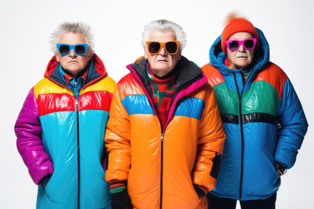Against a pristine white backdrop, a varied ensemble of cheerful European retirees in sportswear radiates satisfaction and togetherness