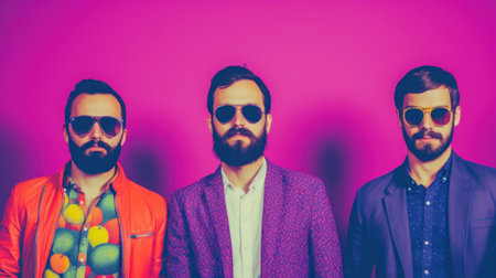 Three men in colorful clothes with sunglasses on a pink background, AI