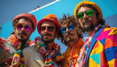 Four musicians are posing together in colorful clothes and sunglasses on a sunny day