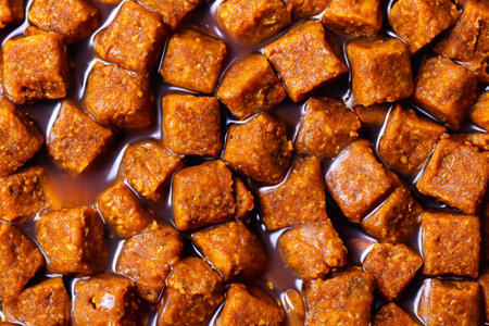 Macro close up of square shaped mini steak Dog treats snack, selective focus