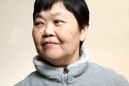 Studio shot of Cheerful portrait close up japaness woman while standing with a blue background.