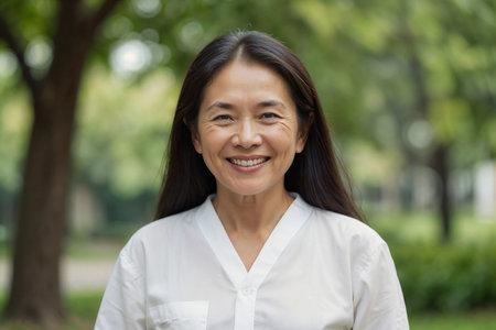 Asian senior woman with a white shirt and black hair is smiling she is standing on the blurry background a green park and looking at camera
