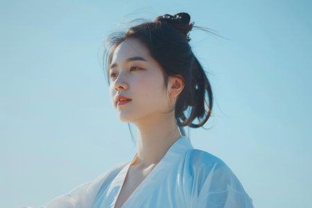 Young woman in traditional attire standing against a clear blue sky with a serene expression The soft breeze gently lifts her hair, creating an ethereal atmosphere