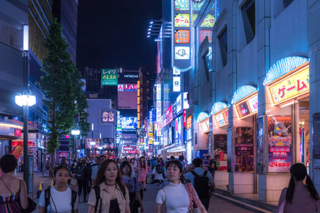 Akihabara, Japan - 23 April 2019 - People walk across main street of famous Akihabara's electronics shopping area on April 23, 2019