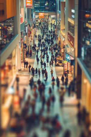 A bustling shopping mall with people walking and strolling, captured in a tilt-shift photography style. The focus is on the movement of crowds through an urban environment. --ar 2:3 --v 6.1 Job ID: 135180eb-91d3-4f4f-b2b4-79664c267399
