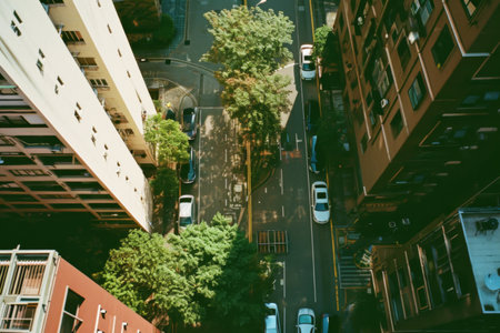 Cinematic top view of a bustling city street filled with vibrant life and color