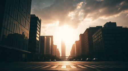 Empty urban street with modern buildings and bright sunlight at sunrise. Ai generated image